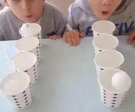 将几个一次性纸杯装满水排成一列,用嘴吹气,将乒乓球运过水面,家长和孩子可进行比赛。