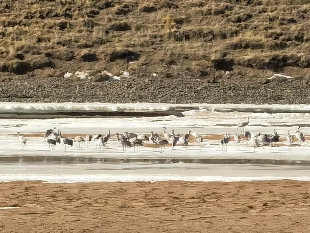 3月13日,在位于玛多县境内的三江源国家公园黄河源园区,记者拍摄到的一群蓑羽鹤在黄河干流河道间栖息觅食。新华社记者 吕雪莉 摄