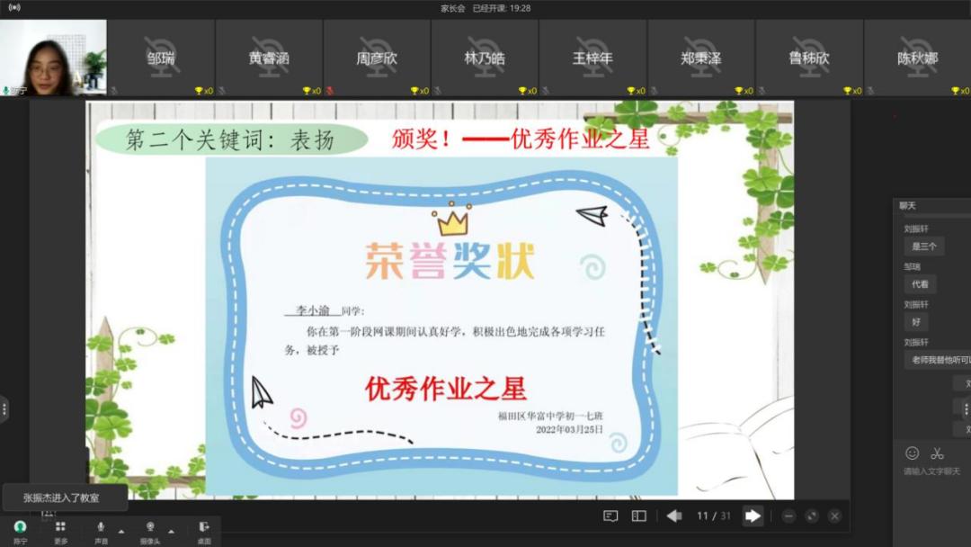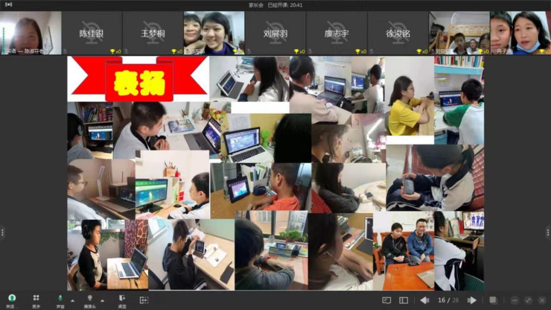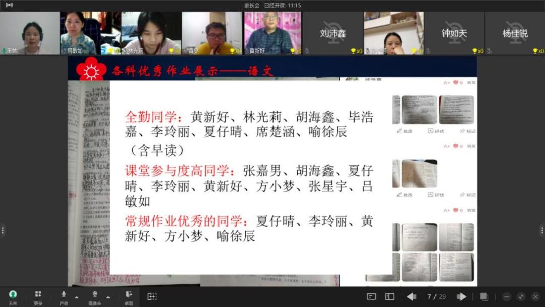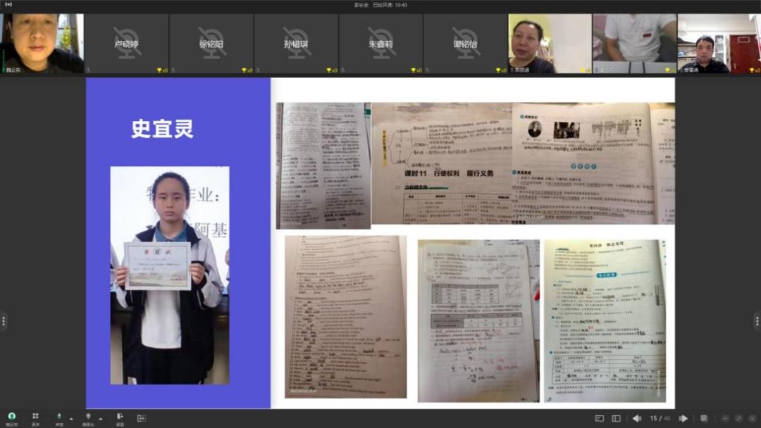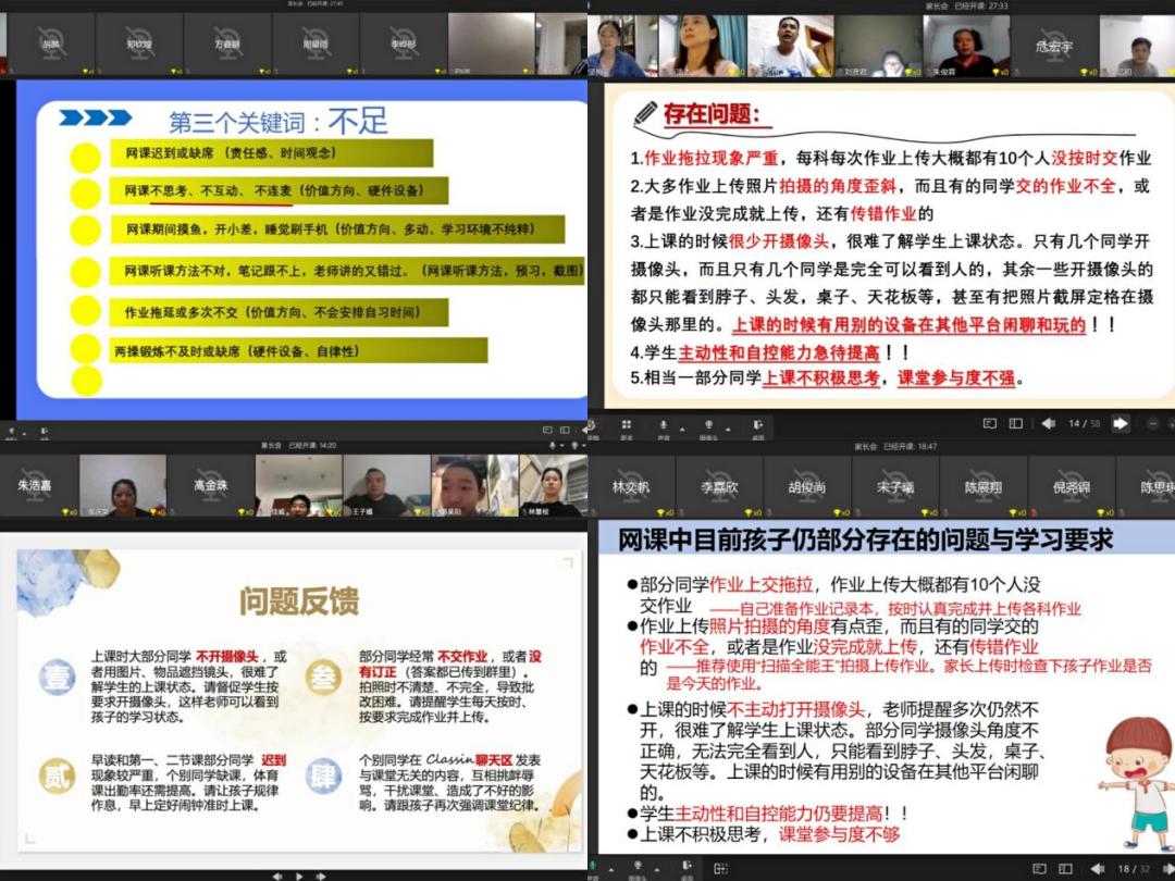 班主任老师们介绍了班级学生线上学习一个多月以来的表现,及时鼓励和表扬学习态度积极、居家劳动表现优异的同学,展示各科学生优秀作业,分享学生网课学习心得,精心制作电子奖状,鼓励同学们再接再厉。同时,也指出各班目前线上学习存在的不足和改进之处,提出各班线上学习的要求,让家长了解孩子真实的线上学习情况。