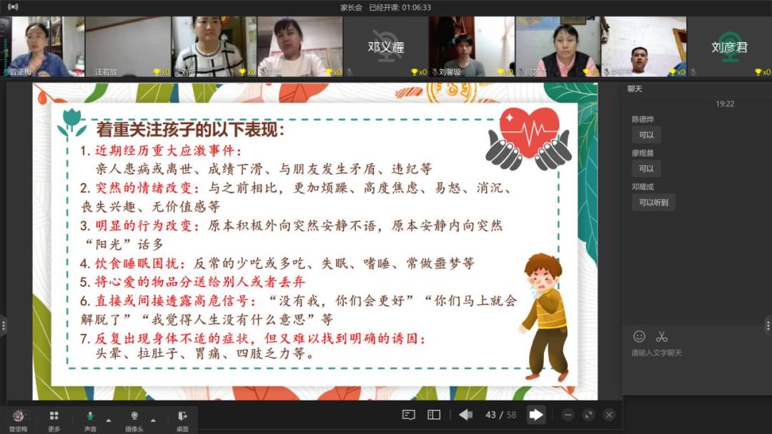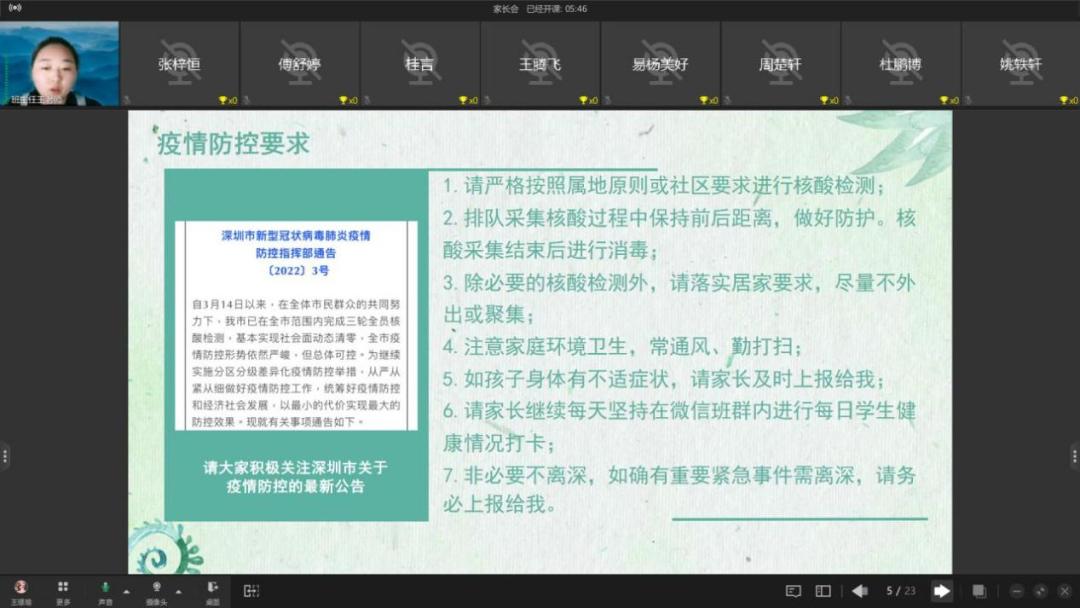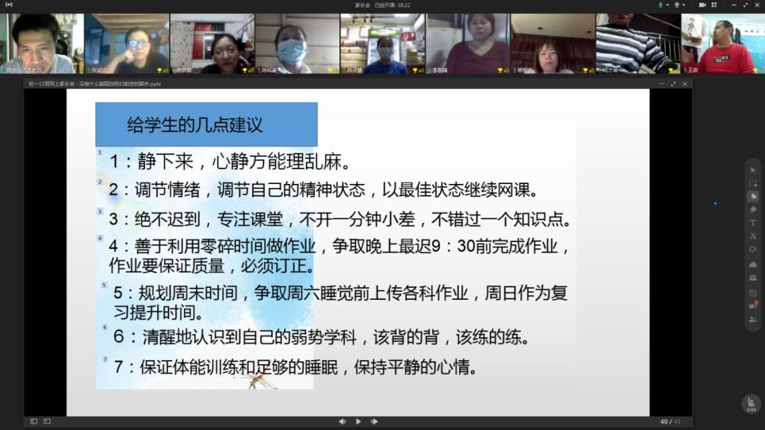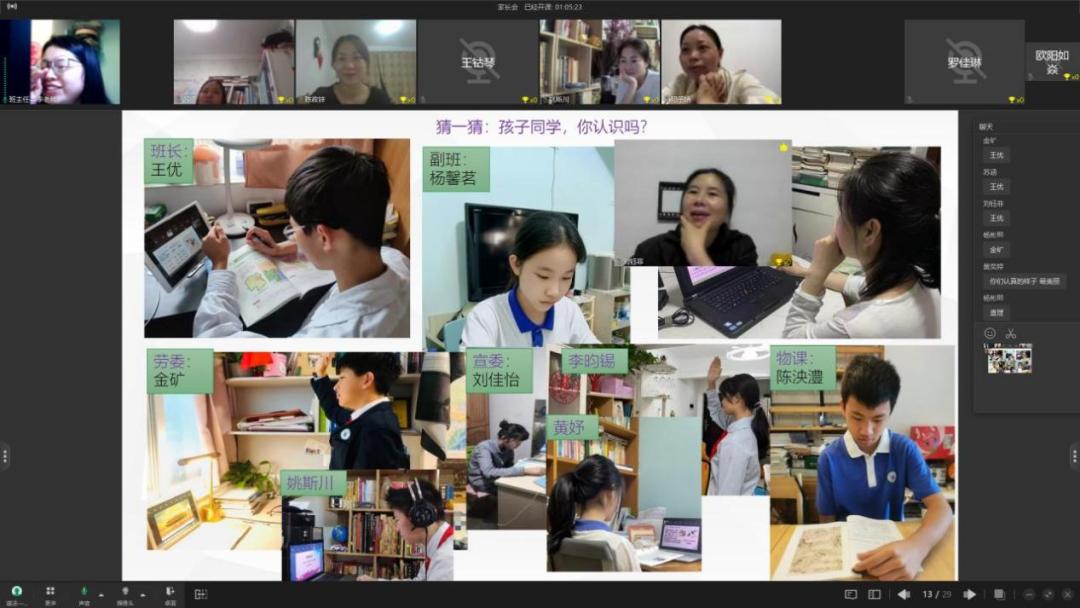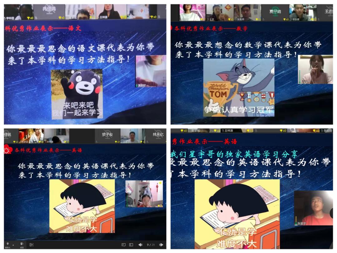班主任老师们介绍了班级学生线上学习一个多月以来的表现,及时鼓励和表扬学习态度积极、居家劳动表现优异的同学,展示各科学生优秀作业,分享学生网课学习心得,精心制作电子奖状,鼓励同学们再接再厉。同时,也指出各班目前线上学习存在的不足和改进之处,提出各班线上学习的要求,让家长了解孩子真实的线上学习情况。