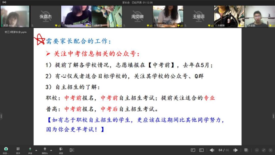 在各年级组带领下,班主任老师们精心准备会议内容、制作PPT、提前发布通知,做好家长会的各项准备工作。本次家长会通过学生网课学习平台Classin开展,让家长们也体验一下孩子上网课的感觉,熟悉孩子每天的学习模式和流程。