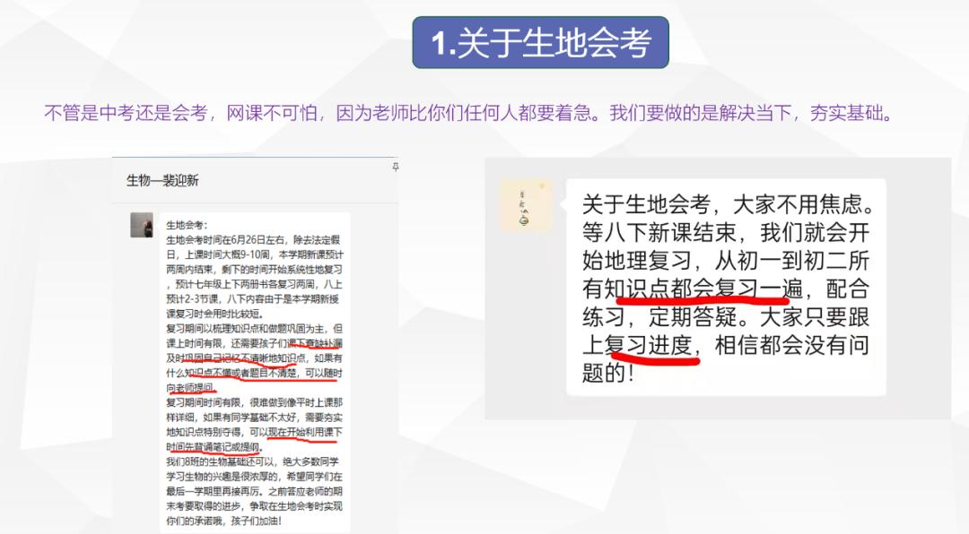 首先我在这里感谢我们学校的全体老师,因疫情停课不停学,您们辛苦了!虽然是网课,老师们依旧很用心,把每个孩子上课的情况以及课后作业情况都反馈给了我们家长,很欣慰。有这么负责的老师真是孩子的荣幸,从中知道孩子哪方面做得好的,继续保持,哪些不足的,我们调整并想办法克服。我也知道自家孩子不是那么爱发言,这也许是性格问题。她用实际行动,证明了她上课是在跟随着老师的。希望孩子稳步前进。期中考试和生地会考的临近,对于初二的学生来说压力也不小。作为父母的我们要做好后勤,及时疏导孩子的心理压力。
