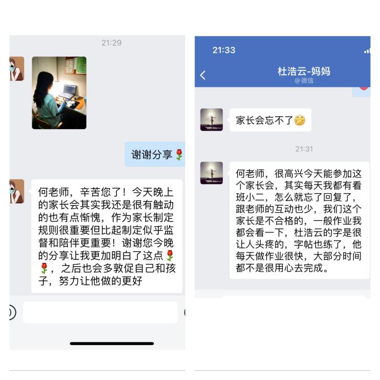 班主任老师们在家长会上的讲解全面周到,家长和孩子们仔细聆听,有的家长在会后用文字表达自己真实的感受。隔空不隔爱,在一个个摄像头中,大家都能感受老师和家长对孩子共同的爱与期望,也共同为了孩子的成长而努力。