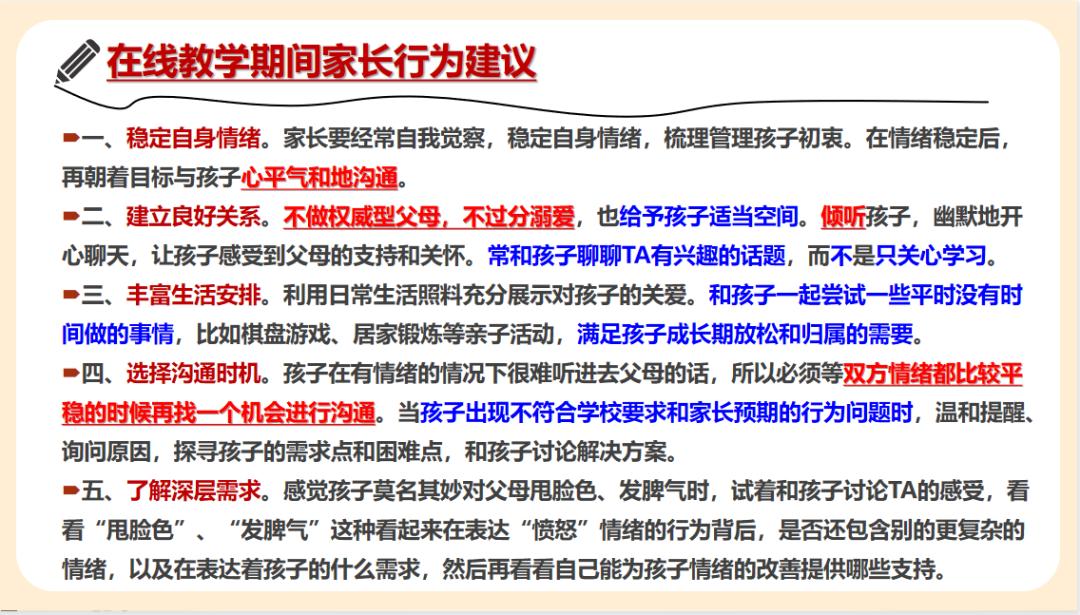 对于居家学习产生的亲子关系问题,各班主任给出了不同的回答和建议——有的班主任结合案例进行分析,循循善诱;有的班主任让家长分享经验,共促成长;有的班主任用公益亲子视频打动家长的内心;还有的班主任做起了互动小游戏,让家长会的氛围和谐而温馨。这些措施让家长和孩子换位思考、相互理解,也缓解了疫情期间亲子矛盾。