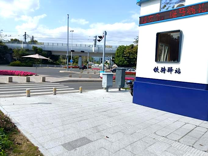 二是补全缺失人行道,清扫慢行障碍。将交警铁骑驿站梯道改至路口一侧,协调城管部门,利用路侧绿地对过窄人行道进行加宽;