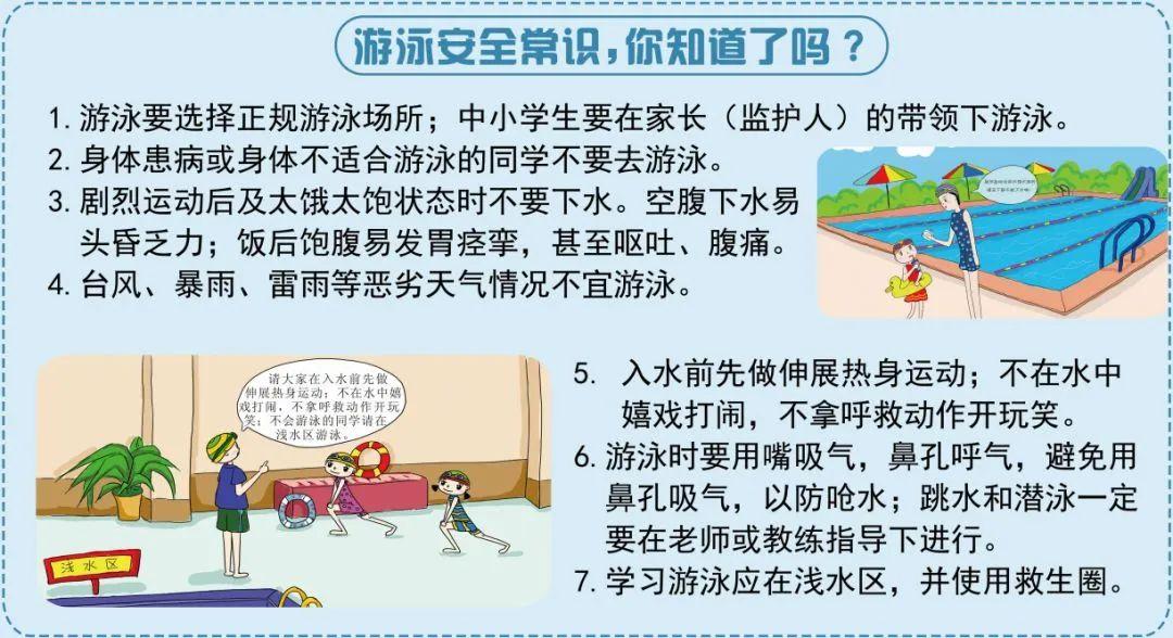 3、叮嘱孩子不要往远处、人少处游。会游泳的孩子也有溺水的可能性,所以家长千万不能放松警惕,严禁孩子到深水池游泳。