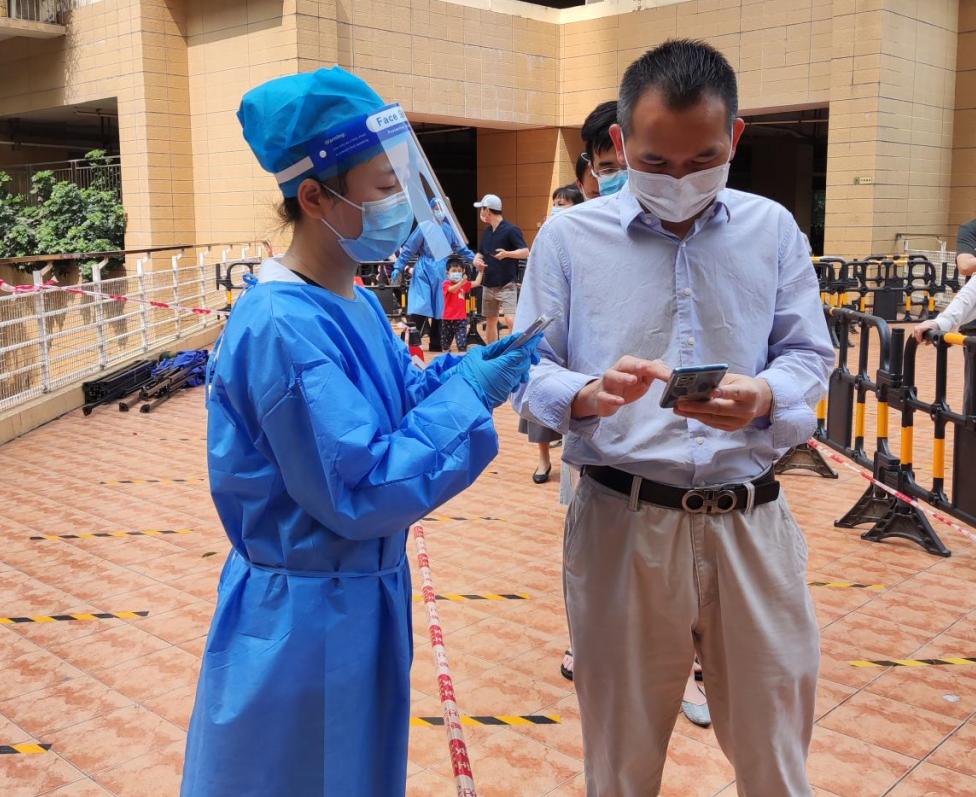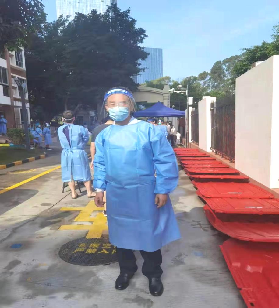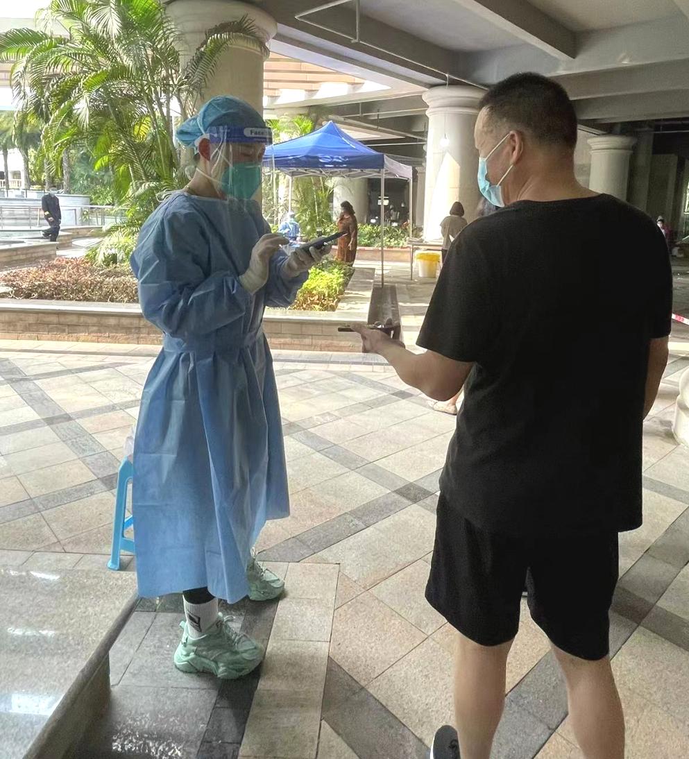 苏国发在疫情爆发后,一直奋斗在抗“疫”一线,分别在南头街道田厦社区、南山街道荔芳社区参与支援者工作。除了协助医护人员采集核酸、打电话做流调、运送物资以外,还有项更艰巨的任务便是穿着厚厚的防护服走街串巷“扫楼”。