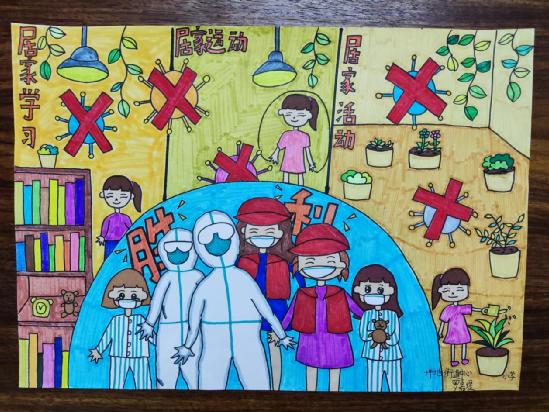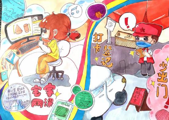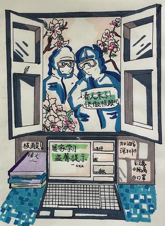 我是一名居家学习的学生,平常最多接触的便是网课,所以作品中融入了网课的元素,而疫情当下春暖花开,春天来临之际,深圳之花杜鹃花便会迎风绽放,与象征着坚韧与希望的医护人员相照应。