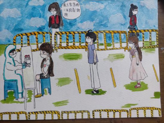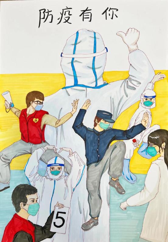 这张作品主要是我在做核酸的时候找到了灵感,第一个“他们”是指医护人员,无私奉献的他们,为保障群众健康,坚持在闷热的防护服里给我们做核酸;第二个“他们”是指义工,他们牺牲自己休息的时间来帮助我们,协调秩序。所以我想把这一副美好的场景用我的画笔画下来。
