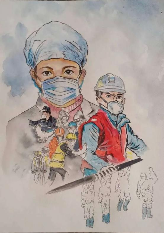 创作灵感源于日常生活的所见所闻,图中描绘了在生活中为我们逆行的英雄,有医护人员、警察、工人以及其他为我们付出的人。
