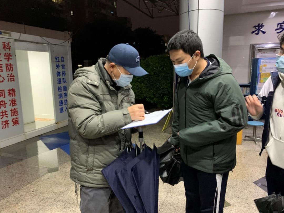 2月21日早上,深圳的温度降到了冰点。为了迎接学生顺利返校,学校做好预案,提前搭好雨棚,准备了充足的防疫物品。上午8时30分,高三学生分批错峰返校,分别入住校内外宿舍。学校领导、老师们一同在校门口迎接,帮忙搬运行李,消毒后运送到指定地点。