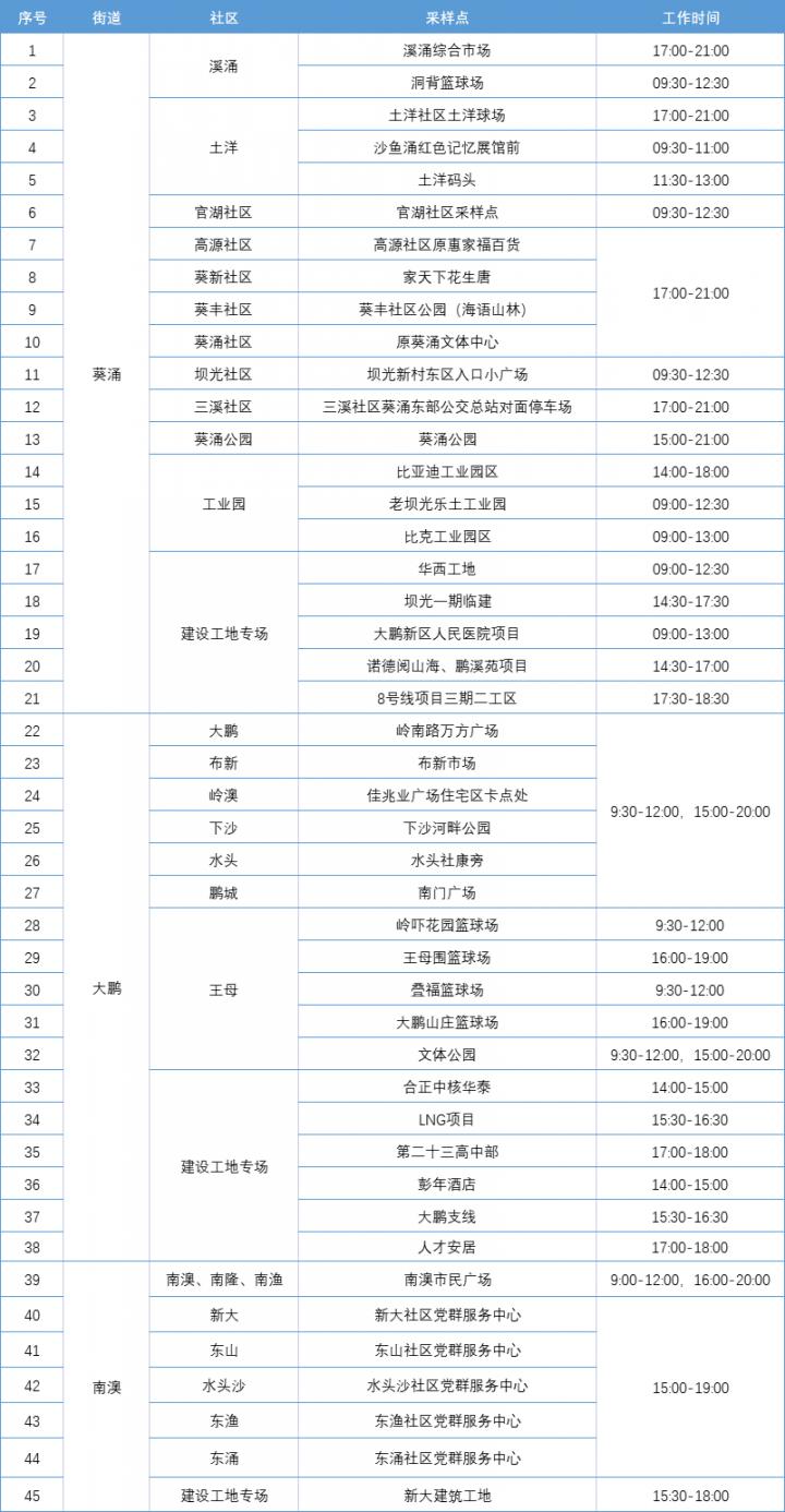 大鹏新区免费核酸检测点一览表