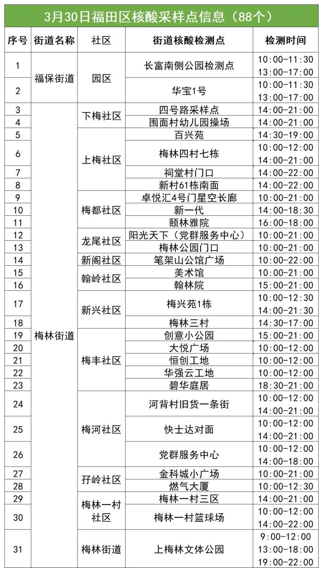 为方便居民进行核酸检测,3月30日,福田区设置88个对外公开的免费核酸检测采样点,为居民提供服务。