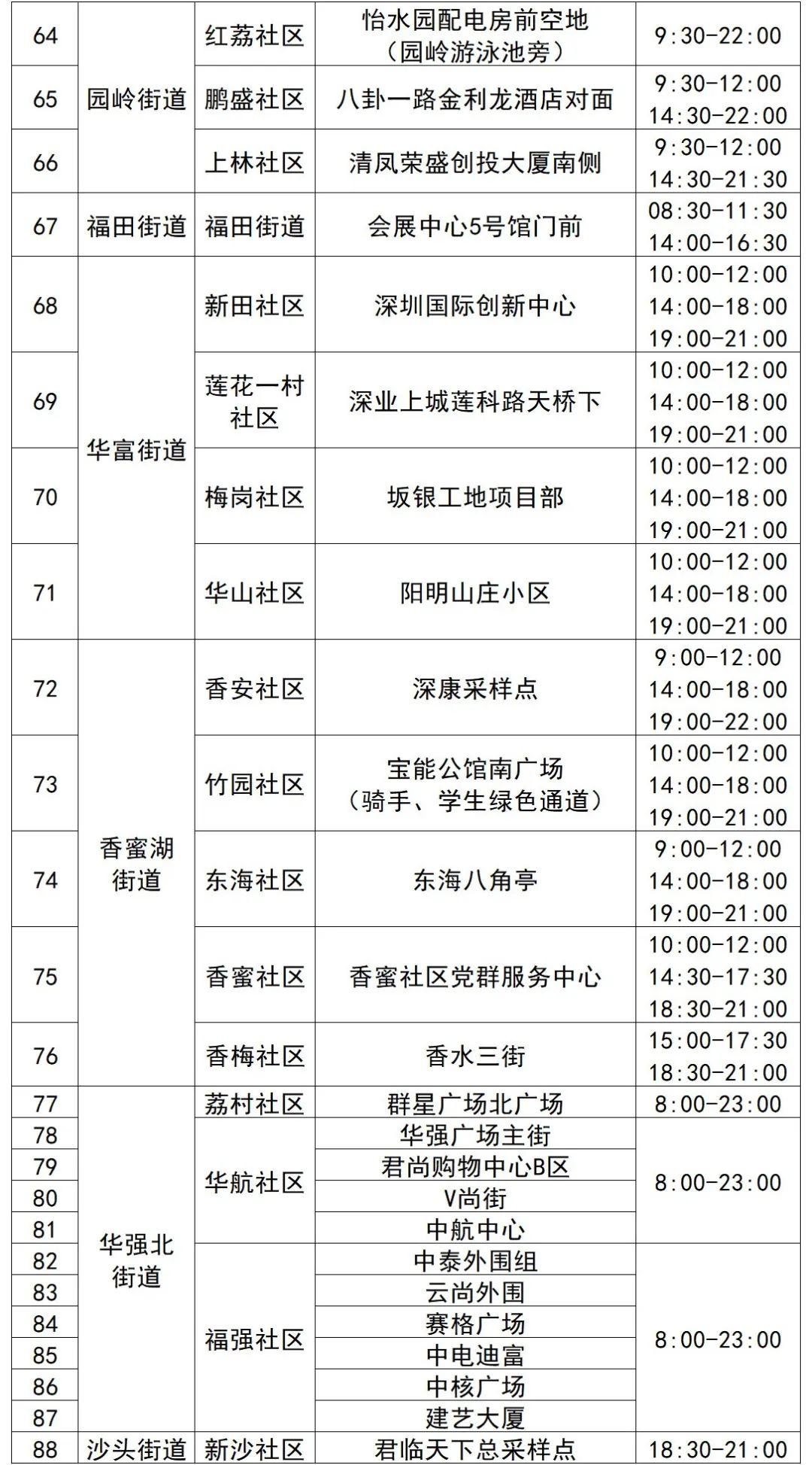 需要注意是,因社区小区、城中村实行“居民白名单制”管理,免费核酸检测采样点名单及检测时间具体以各街道部署为准,请市民持续关注。