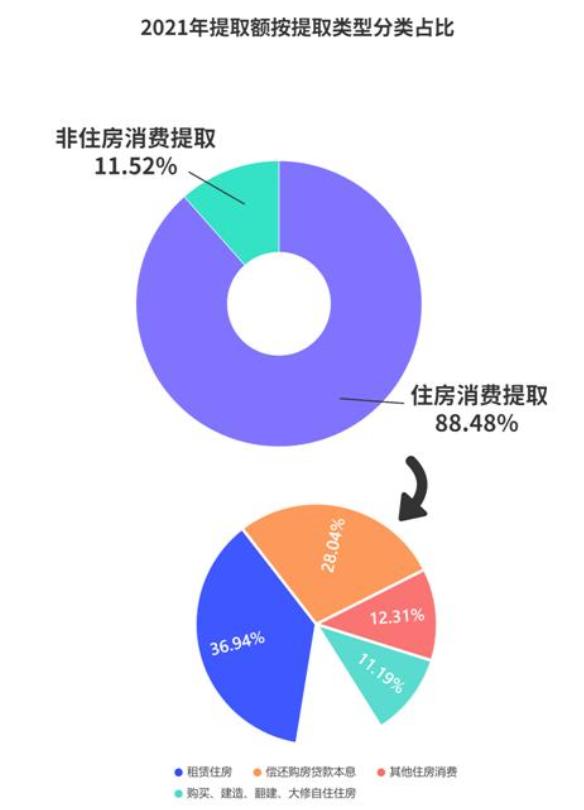 2021年,344.95万名缴存职工提取住房公积金613.39亿元,提取额同比减少1.20%。提取金额中,包括购房、租房、还贷等住房消费类提取占88.48%,离休和退休等非住房消费提取占11.52%。