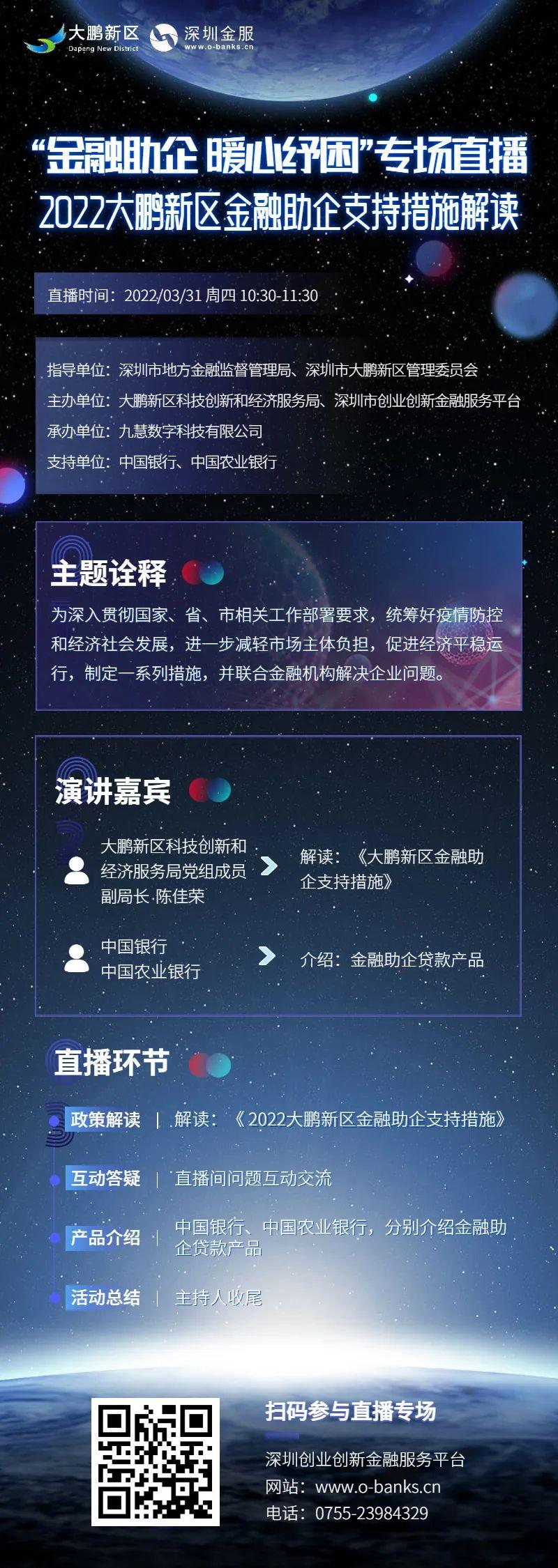 为更好助力新区企业发展,提升金融惠企政策知晓度,大鹏新区科技创新和经济服务局积极联系深圳市创业创新金融服务平台共同筹备辖区银企对接活动,并于2022年3月31日开展“金融助企,暖心纾困” 线上直播活动。欢迎辖区广大企业扫码参加直播活动!