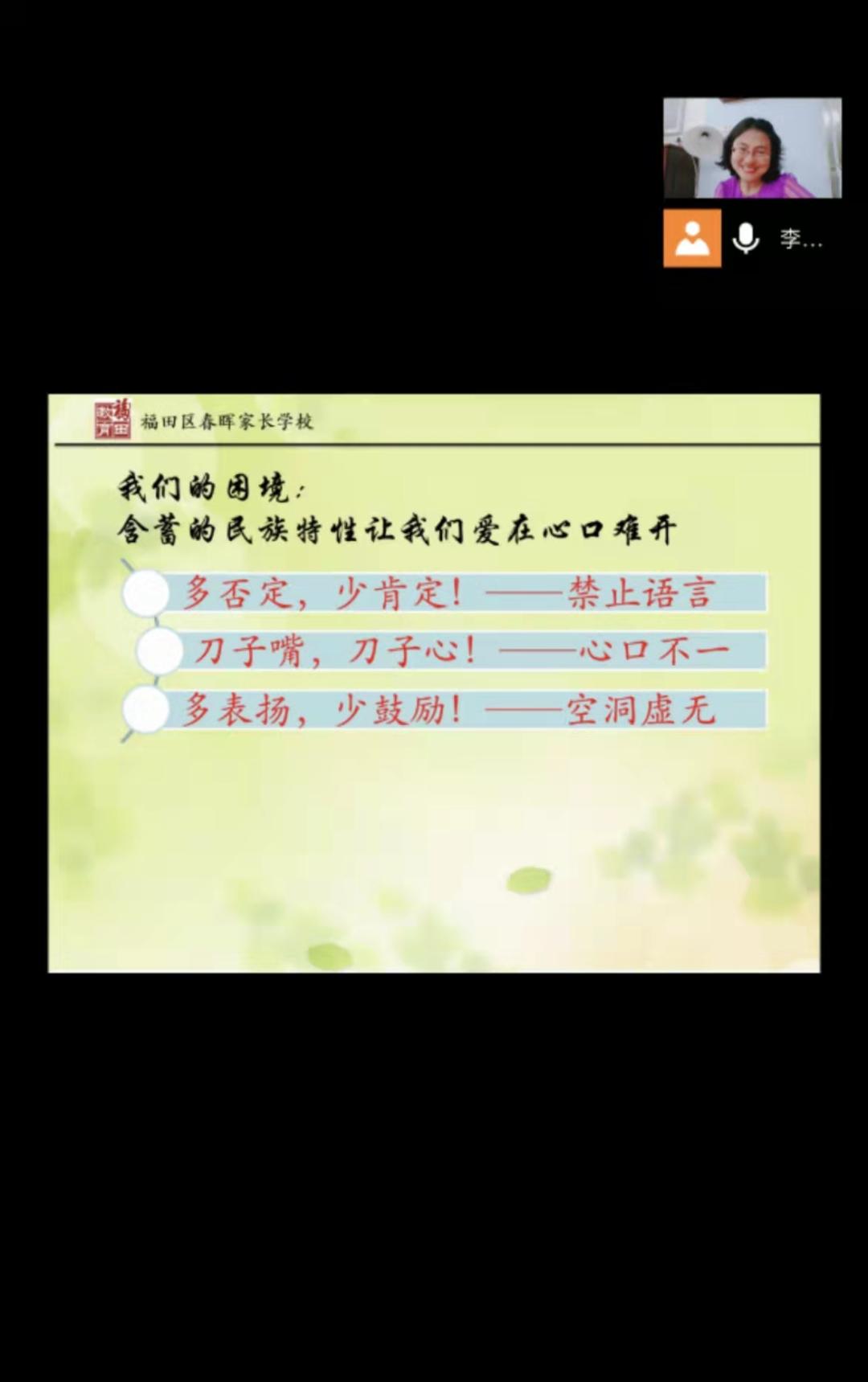 中心负责人深圳市名班主任工作室主持人李元琳,还在线上为福田区部分学校的小一家长开展了春晖家长学校的讲座——《积极鼓励,为爱助力》,减缓了疫情期间家长的焦虑。同时,受团市委邀请,她还录制了家庭教育指导小视频,传播爱的力量。