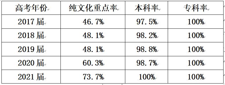 纯文化重本率73.7%,综合重本率80.7%,全市前10。本科率100%。