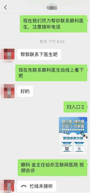 了解程女士的病情后,该片区负责“三区”医疗救助的宝安区人民医院第五大道社康中心医务人员立即联系医院眼科金玲主任,并迅速在互联网医院为程女士预约挂号。与眼科专家面对面视频看诊后,程女士的心情终于恢复了平静。金主任建议她要用的眼药正好是常用药,家里有现成的,都不用另外去买。她按照金主任视频指导的方法再自行冲洗了几次眼睛,用了眼药水,症状很快缓解。第二天,社康中心医生回访时,程女士已经没有任何不适了。