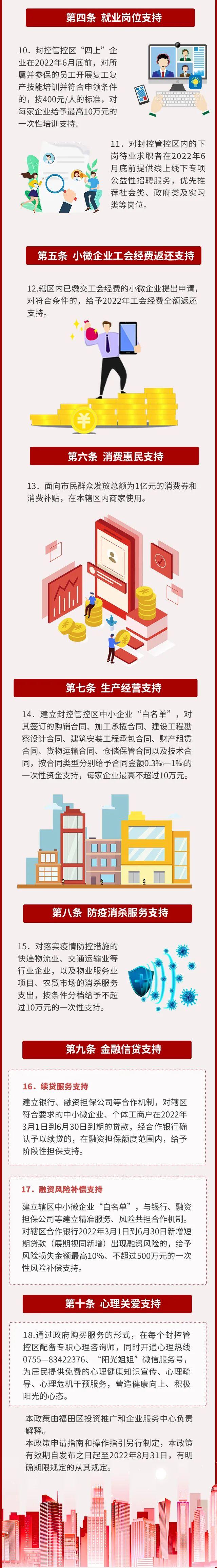 3月20日,福田区针对受疫情影响较大的中小企业,迅速出台了《福田区支持企业同心抗疫“十条”政策》,并于当日率先落地见效,得到社会广泛点赞。近日,福田区持续密切关注经济运行情况,科学研判疫情给企业带来的影响,聚焦实际发展需要,出台了防疫惠企政策《深圳市福田区稳企惠民纾困“十条”政策》(以下简称新十条),有针对性地从城中村租户商户纾困、惠民纾困、租金减免、就业岗位、小微企业工会经费返还、消费惠民、生产经营、防疫消杀服务、金融信贷、心理关爱等10个方面对企业、个人给予支持。