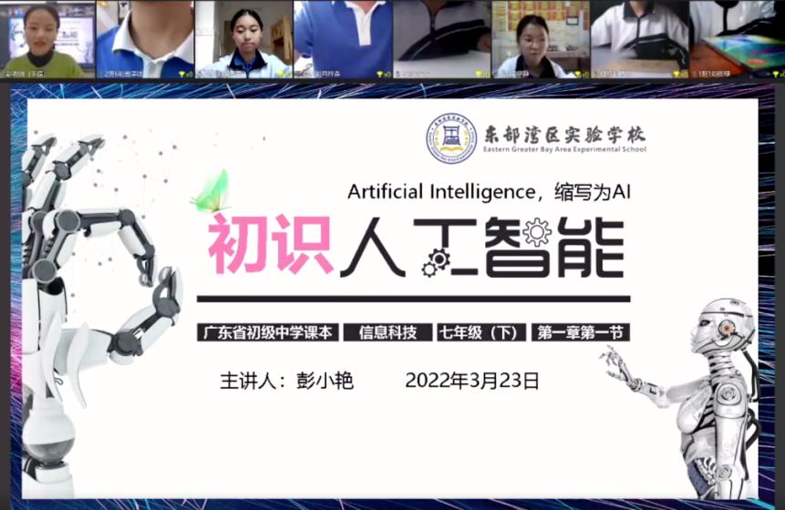 东部湾区实验学校教师彭小艳《初识人工智能》的在线课堂同样精彩纷呈。彭老师通过学生课前体验、课中情景化活动展示、学生分组讨论等方式充分激发学生的学习兴趣,让学生在了解人工智能的一般定义以及时下热门研究内容的基础上,逐步引导学生深入思考,培养学生的创新思维与探究能力。