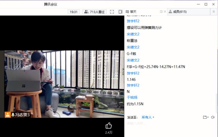 冯老师大胆创新,将课堂搬到色彩斑斓的阳台,讲台变成2米的长鱼缸,鱼儿悠然穿梭水草间的美景映入眼帘,成功吸引学生的眼球。采用双屏结合的方式,实现“直播互动+课堂板书”相配合,授课方式也从枯燥地复习讲解浮力知识,变成富有挑战性和趣味性的“如何给鱼缸布景”,在解决问题的过程中,实现知识的迁移和内化,高效完成浮力知识的复习,学习也成了一种轻松愉悦的行为体验。
