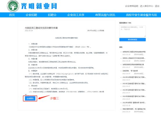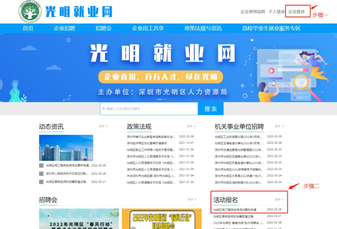 (一)提交申请。企业登陆“光明就业网”进行用户注册,在“活动报名”栏目点击“光明区用工稳岗支持活动意向申请”,进入申请页面,并根据要求填报申请。