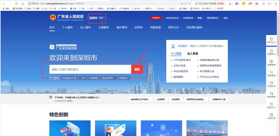 (注意在左上角将定位切换至深圳市,在搜索框中搜索业务名称即可在线办理。)