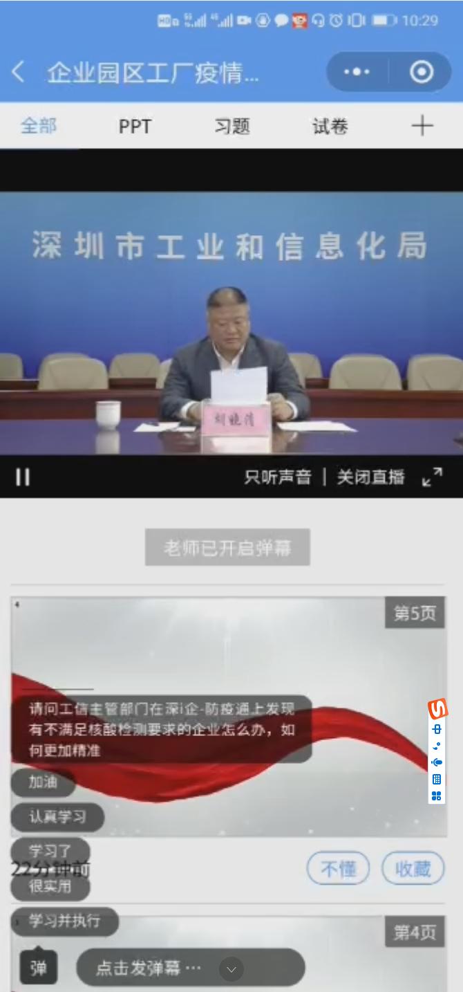 开班式后,学员集中观看了《习近平总书记关于疫情防控的重要论述》《加强疫情防控知识学习 提高疫情防控工作能力》等教学视频,了解掌握疫情防控的基本政策、基本要求、基本知识。随后按照分场景的要求,学员结合岗位职责和工作实际,分别加入机关单位、社区小区、企业园区工厂疫情防控三个课堂,针对性集中观看《科学精准防疫 高质量保障机关安全有序运转》《坚决筑牢社区小区疫情防线》《城中村疫情防控工作指引》《企业园区和工厂及“深i企-防疫通”APP培训》视频课程,全面系统学习本部门本行业本领域疫情防控知识。为保障学习效果、增强互动性,学习过程中安排行业主管单位负责同志在线主持,组织学员在线交流讨论,就遇到的问题进行答疑解惑并进行工作部署,巩固学习成效。