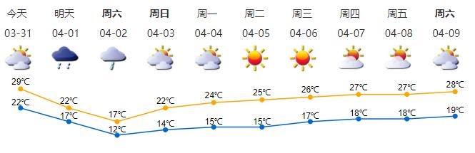 ●3月31日,多云,气温22-29℃,夜间转(雷)阵雨。4月1日-2日,受较强冷空气影响,阴天有小雨;4月2日,气温降至12-14℃,体感寒冷。4月3日-5日(清明假期),晴天干燥,气温逐日回升。