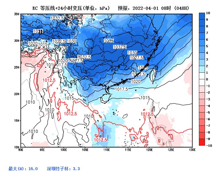 △4月1日变压预报图,蓝色部分即为冷空气所在区域