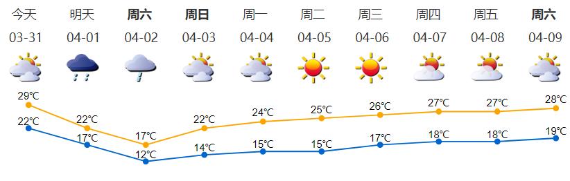 3、31日夜间有(雷)阵雨,4月1-2日间中有小雨,户外防疫注意做好防雨防风防雷和防寒保暖准备。