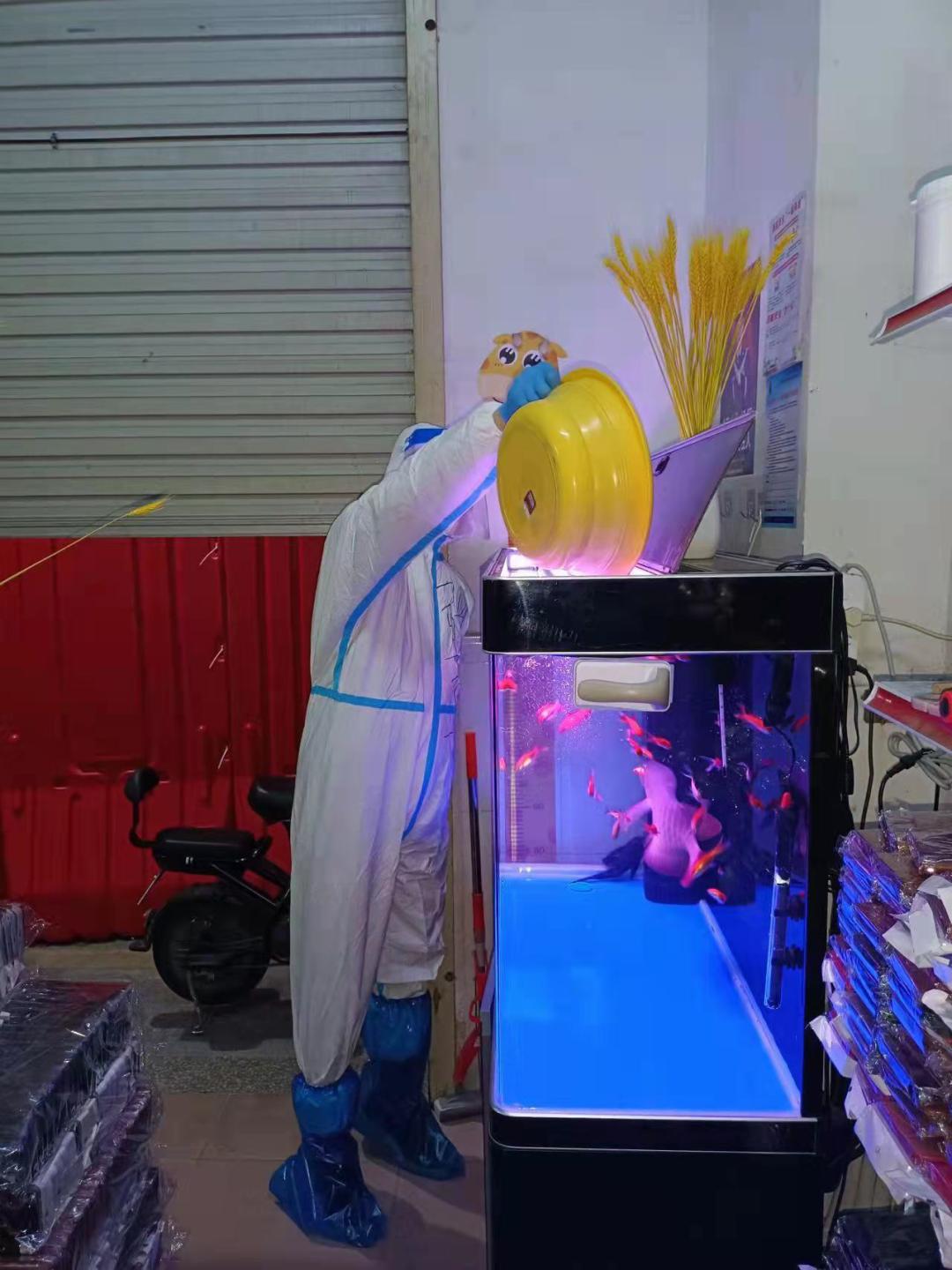 刚刚结束一天防疫工作的我看到消息后,饭都来不及吃,便重新穿上刚刚换下的防护装备,趁着朦朦夜色,迅速赶往求助居民所在的封控楼,接过商铺钥匙后又马不停蹄赶往商铺。生活中粗枝大叶的我,喂鱼时却不敢有丝毫马虎!我在店内监控视频中与鱼儿主人反复确认注意事项,小心翼翼地换水、喂鱼。