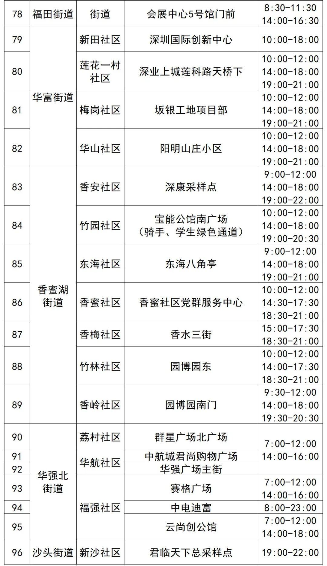 需要注意是,因社区小区、城中村实行“居民白名单制”管理,免费核酸检测采样点名单及检测时间具体以各街道部署为准,请市民持续关注。