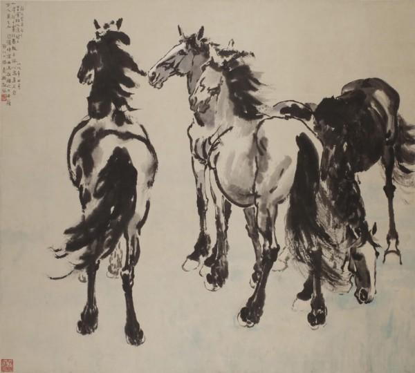 徐悲鸿先生熟悉马的脾气禀性。在技法上,他以中国的水墨为主要表现手段,泼墨写意或兼工带写,又参用西方的透视法、解剖法等,逼真生动地描绘了马的飒爽英姿,从而能够成马在胸,游刃有余地去捕捉瞬间即逝的动态神情,得心应手地采用前人不敢涉猎的大角度透视,创作出崭新的艺术形象。