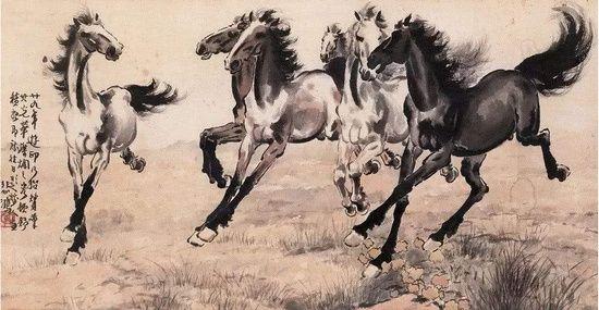 徐悲鸿先生的《六骏图》是他作品中特别经典的存在,《六骏图》表现的是一往直前奔驰不停中的六匹骏马,六匹马的姿态、方向、疏密、色调都作了精心安排,表现手法不同于唐宋画马之法。这六骏的绝妙之处在于,第一是巧妙的构图,第二是透视,第三是墨色。