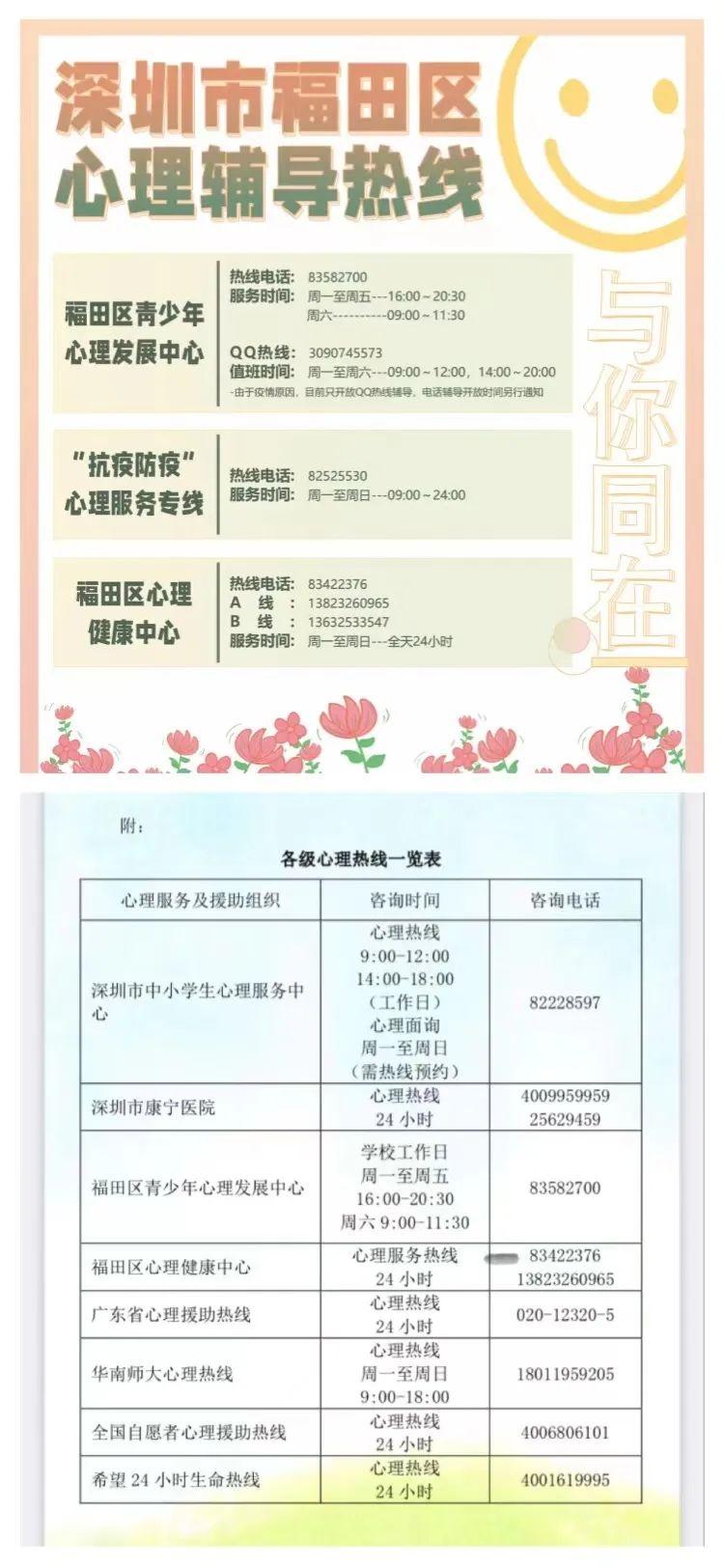 红岭石厦部心灵驿站,由校心理辅导中心负责,向每位学生发送联络方式,随时为同学们排忧解难。以“班级+姓名”的格式添加QQ:179421333或留言邮箱179421333@qq.com。时间:周一至周五9:00-12:00,14:00-18:00。学生处也多次在班主任群转发市、区的心理热线,并要求班主任务必转至家长群,让家长们的求助获得专业的建议,感受到我们心理工作者的暖心陪伴。