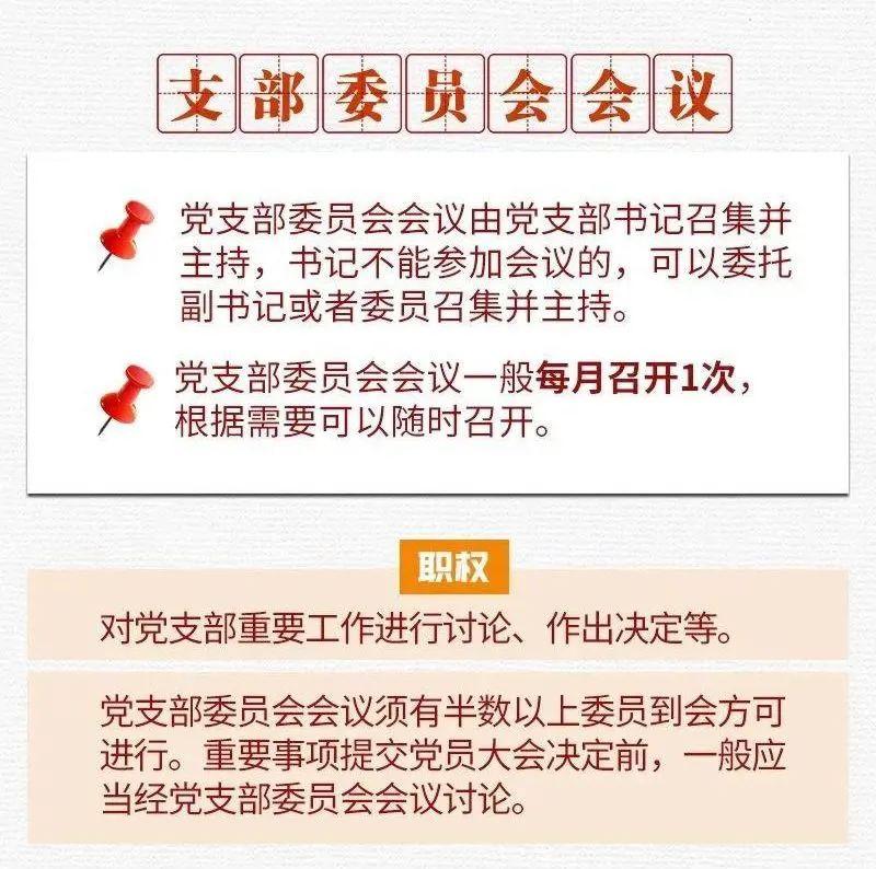 小提示:党支部委员以及党小组组长参加;必须有半数以上委员参会;政治理论学习、思想交流;有议有决;记录完整。
