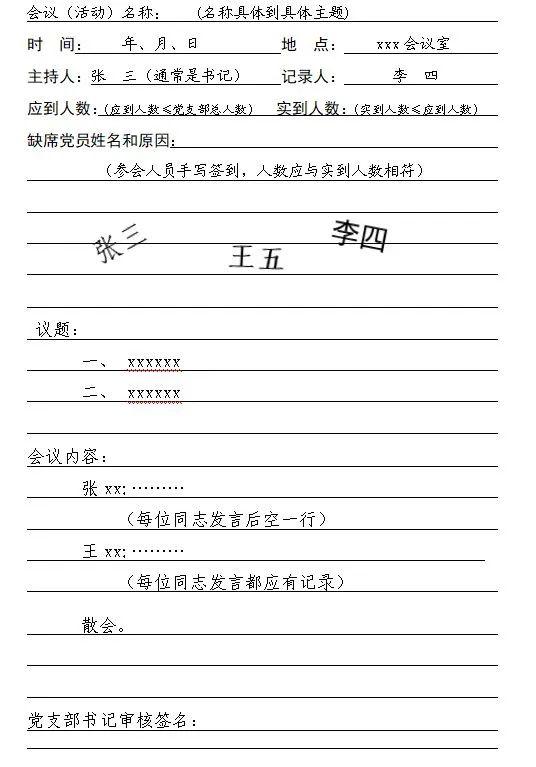 小提示:必须有半数以上有表决权党员参会;议题明确;记录完整。