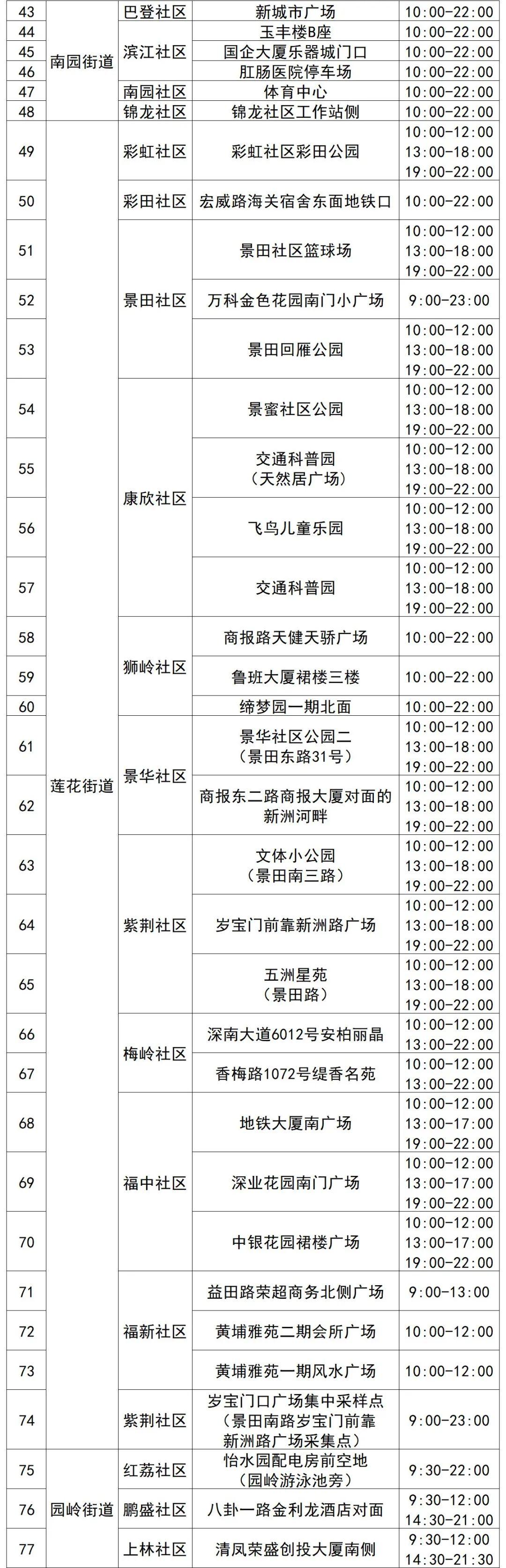 需要注意的是,因社区小区、城中村实行“居民白名单制”管理,免费核酸检测采样点名单及检测时间具体以各街道部署为准,请市民持续关注。