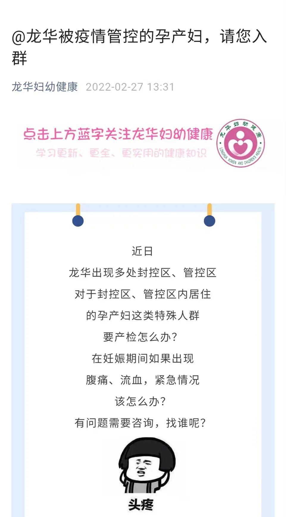 第二天龙华妇幼发出《我是孕产妇,小区被划为封控区、管控区怎么办?龙华妇幼:可线上寻求帮助和咨询》的微信推文,向全社会公布了“孕产妇关爱群”进群二维码。