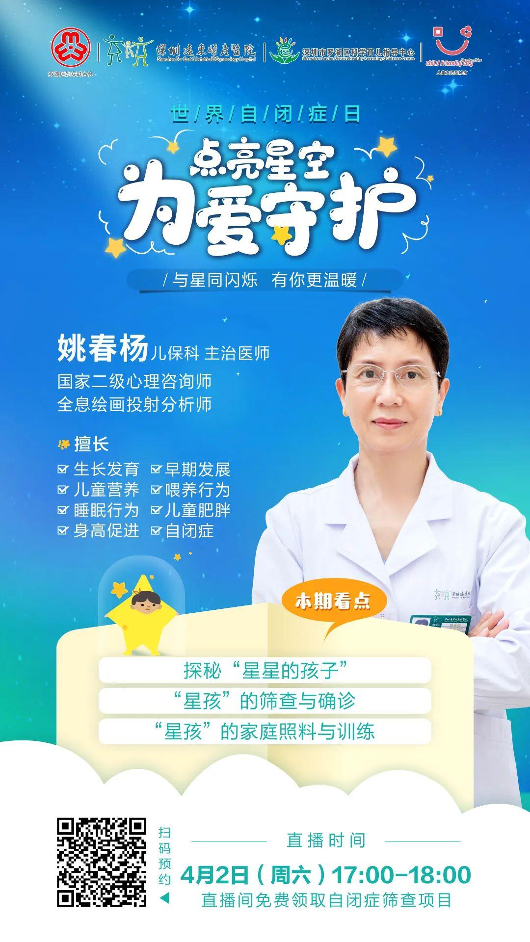 2022年4月2日为第15届世界自闭症日,为让更多家长了解自闭症,更多星星的孩子被发现、被关注、被理解,深圳远东妇产医院联合深圳市罗湖区妇女联合会以此契机,共同打造“点亮星空 为爱守护”关爱自闭症儿童直播活动,进入直播间的小伙伴们,都可以领取孤独症免费检查哦!