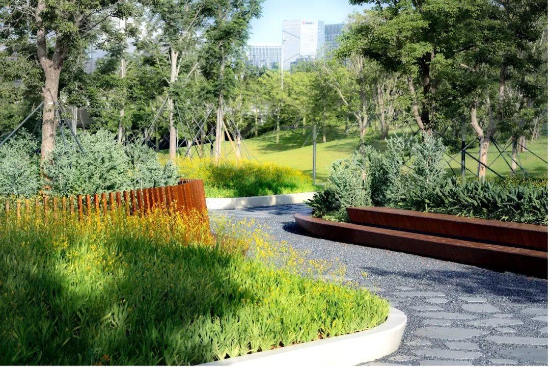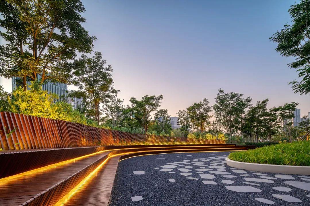 公园以桂湾河水系为核心设计灵感,以“绿芯”为主题,采用景观都市主义设计手法,用优美的“线型设计语言”编织布局,打造一个生态共享、多元活力的绿色公园。