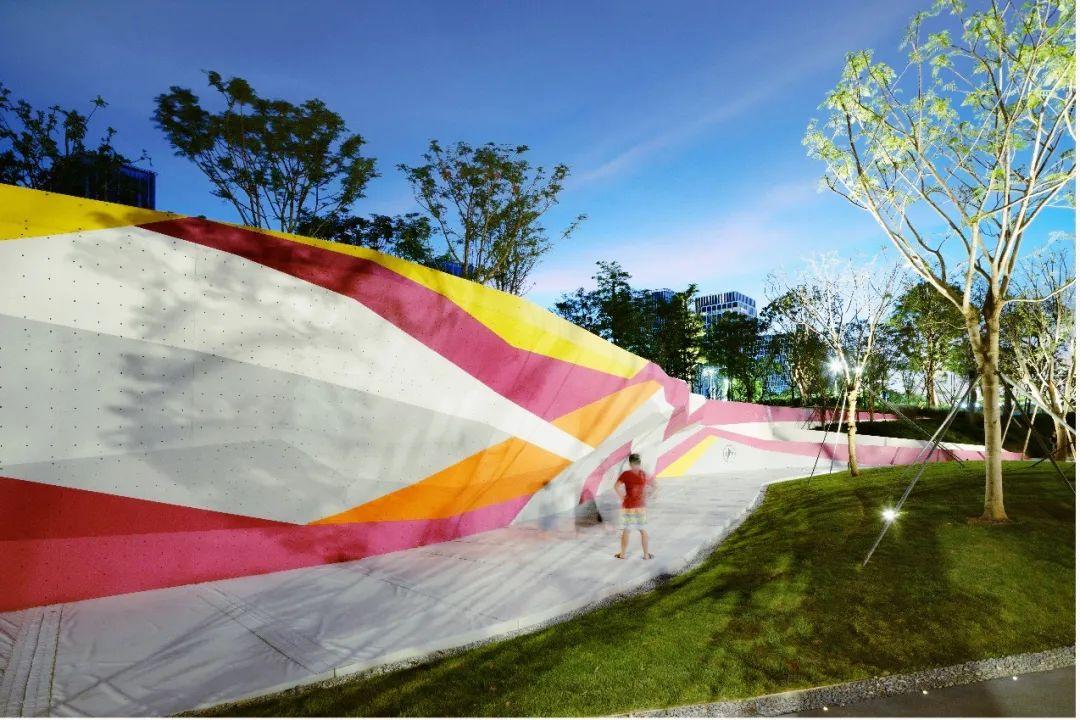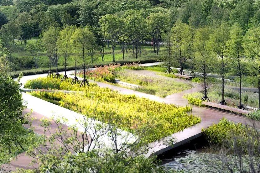 公园通过雨水回用系统、生态碎石沟、雨水花园、下沉绿地、植草沟、透水艺术铺地等元素疏导利用雨水和地表径流,打造可持续的弹性城市空间。