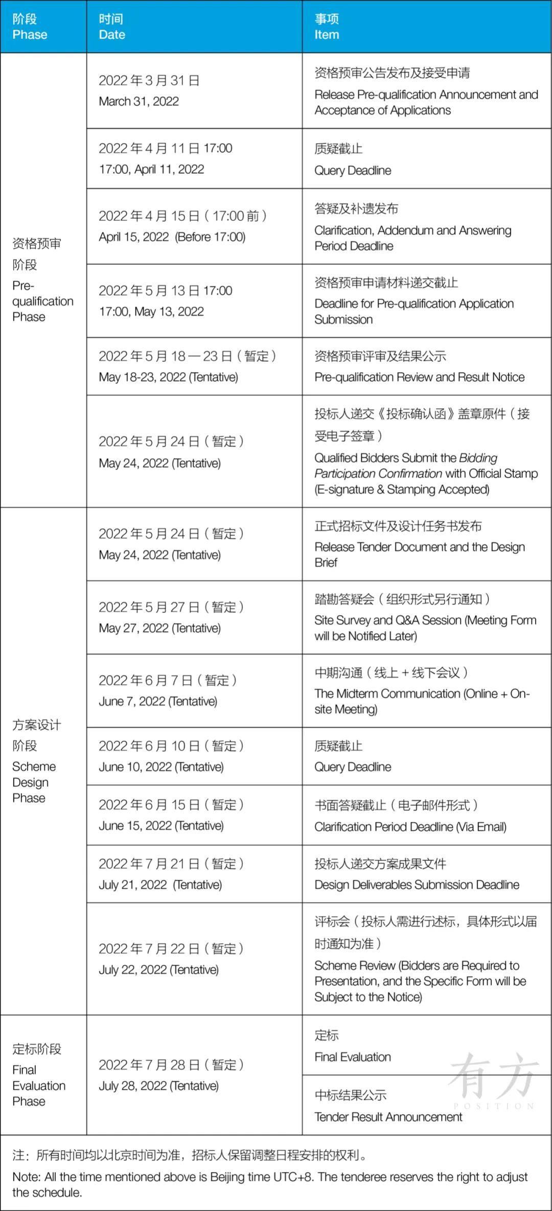 The project adopts the method of "open call", which includes 3 phases: pre-qualification, design competition and final evaluation. The compensation is set for bidders that are qualified but fail to win the bid.
