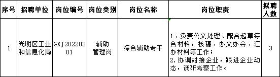 根据工作需要,深圳市光明区工业和信息化局面向社会公开招聘一般类岗位专干3名。现将有关事项公告如下: