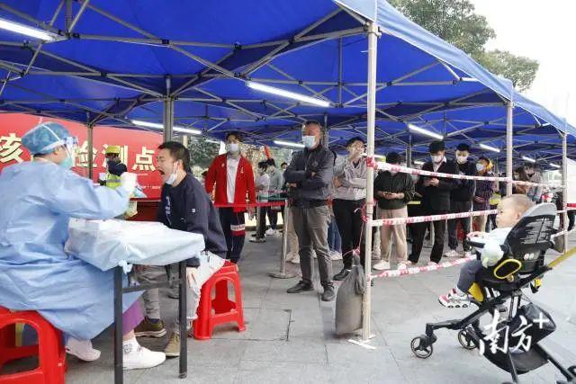 在宝安中心一采样点,婴儿车内的小宝宝正等待自己父亲检测核酸。