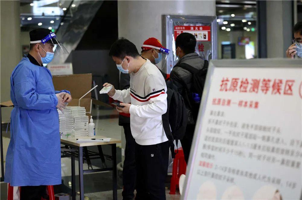 3月27日,在合肥火车站出站大厅,出站旅客领取免费发放的抗原检测试剂。新华社发(解琛 摄)