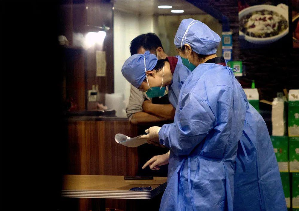 3月17日凌晨,上海市青浦区疾控中心流调人员在相关场所进行排摸。新华社记者 刘颖 摄