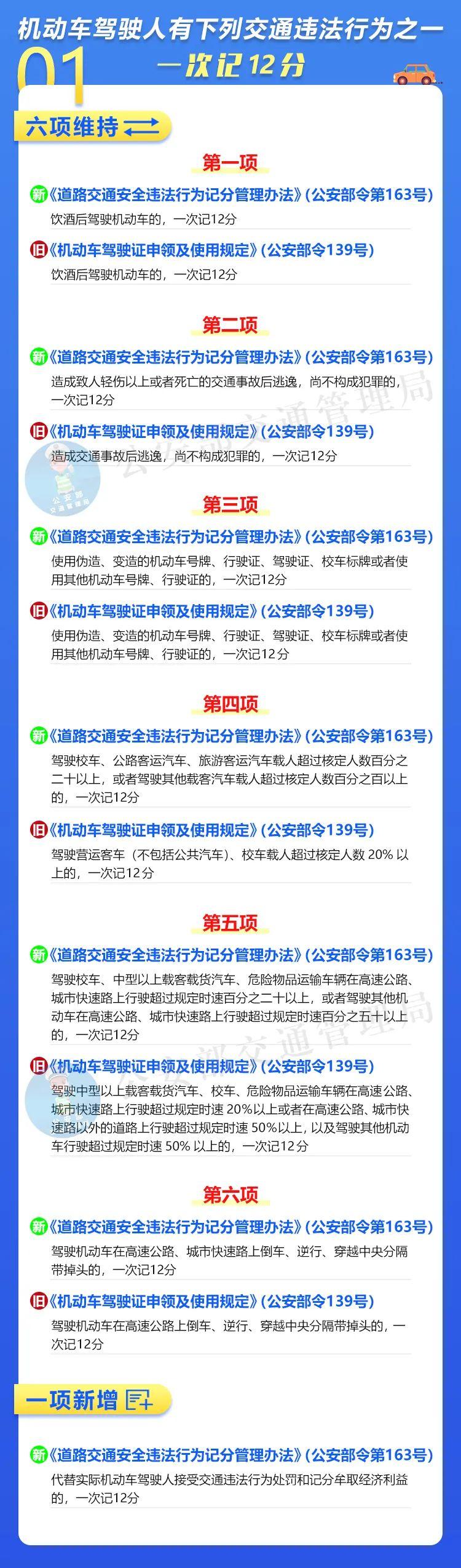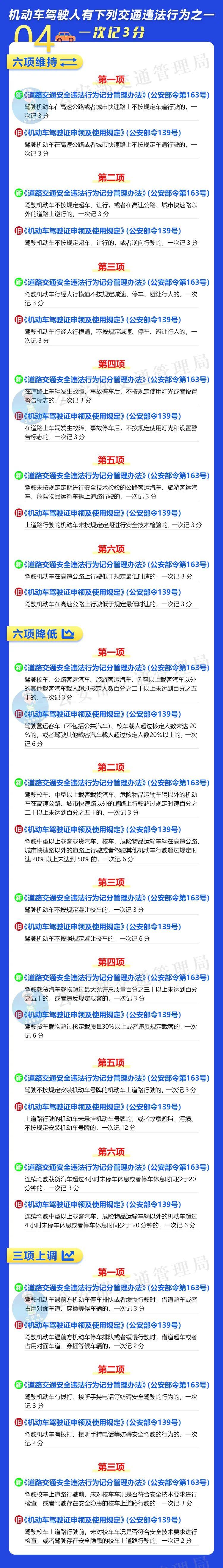 三是减少一次记满12分的记分行为。调整后一次记12分的记分行为由11项减少为7项,新增一次记9分的记分行为7项,一次记6分的记分行为由14项减少为11项,一次记3分的记分行为由12项增加为15项,一次记1分的记分行为由4项增加为10项。